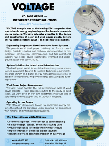 VOLTAGE Group – ваш надійний партнер у сфері енергетики. Компанія на ринку з 2009 року та поєднує досвід, передові технології та інноваційні підходи для реалізації складних енергетичних проєктів у країнах Європейського Союзу та Україні. Власна досвідчена проєктна група спеціалізується на проєктуванні високовольтних трансформаторних підстанцій 110–330 кВ, що забезпечують стабільну передачу та розподіл електроенергії, проєктуванні ліній електропередач високої напруги для безперебійного енергопостачання, розробці промислових сонячних електростанцій та вітропарків, що відповідають найсучаснішим екологічним стандартам, інтеграції промислових систем накопичення енергії (BESS), що забезпечують гнучкість та надійність енергетичних систем та комплексному енергетичному аудиту та розробці оптимальних рішень для ефективного енергоспоживання.